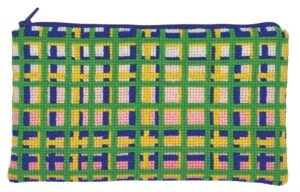 En pung fra Fru Zippe i flotte grønneog gule farver, inspireret af Yvonne fra Olsen Banden. Broderes med korssting på stramaj.