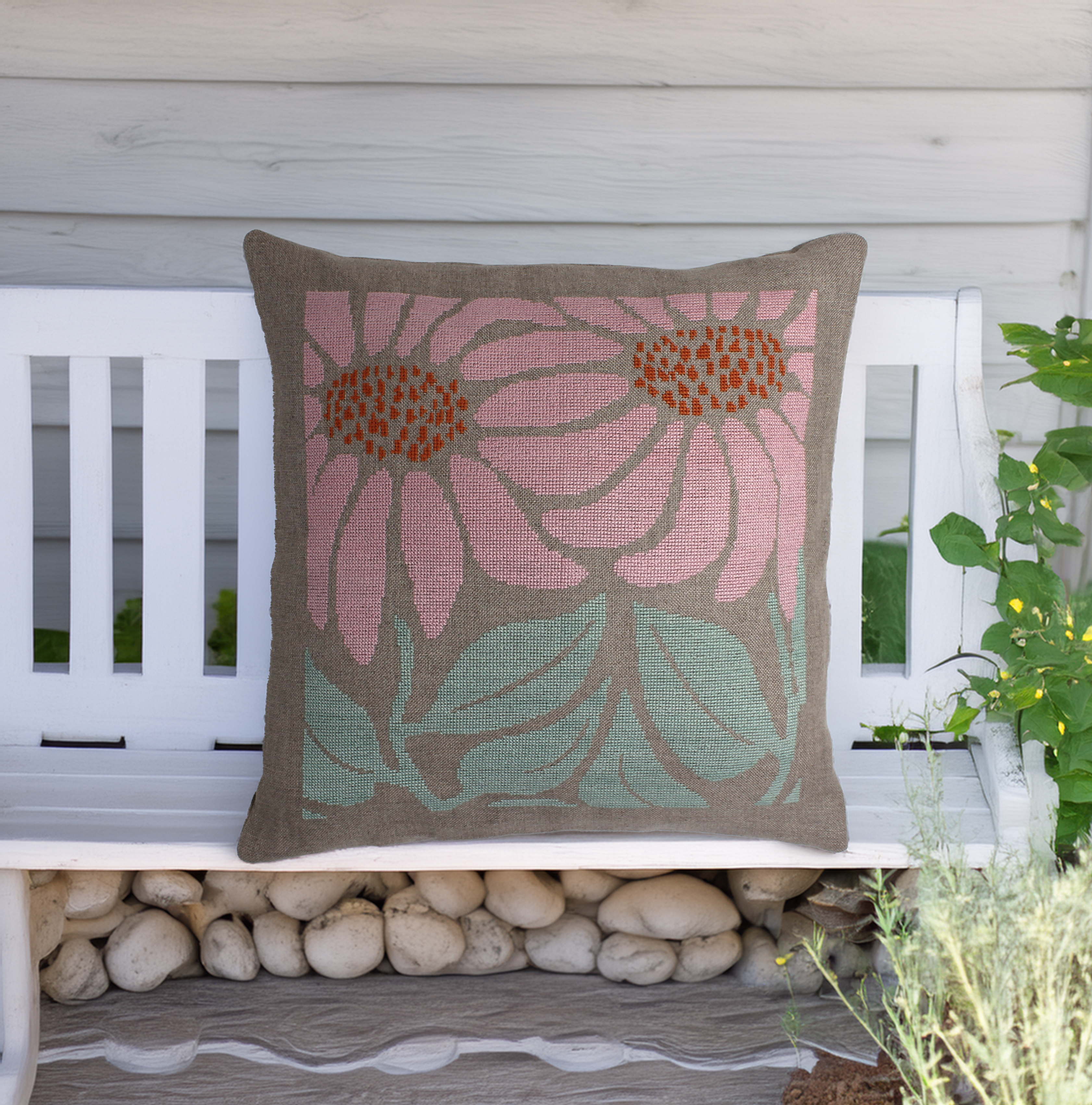 Smuk stilfuld pude med de flotteste stilistiske pink blomster, der passer perfekt på terrassen eller i stuen.