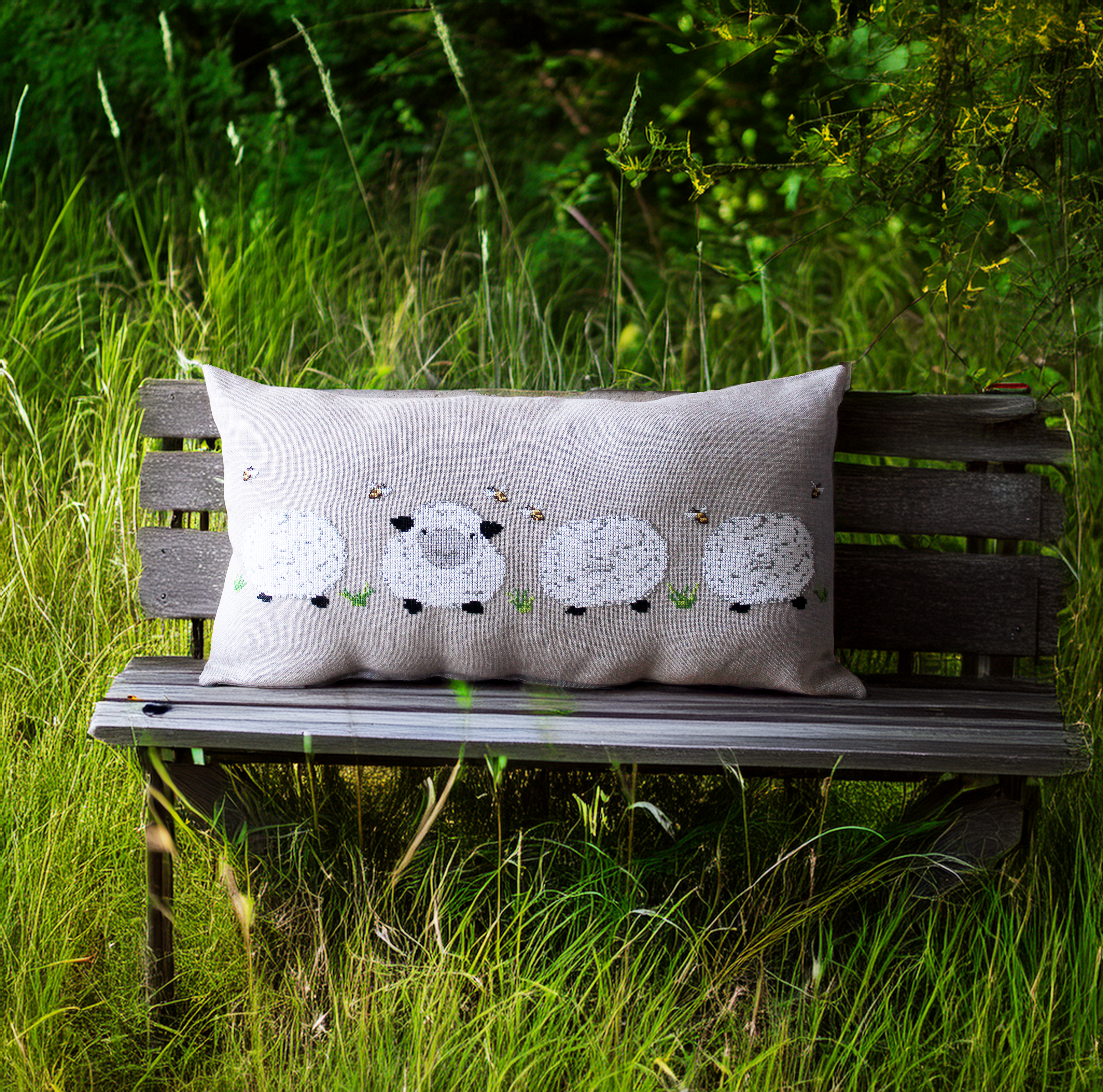 Skøn pude med en række får, bier og græs, der passer perfekt på terrassen eller i stuen.