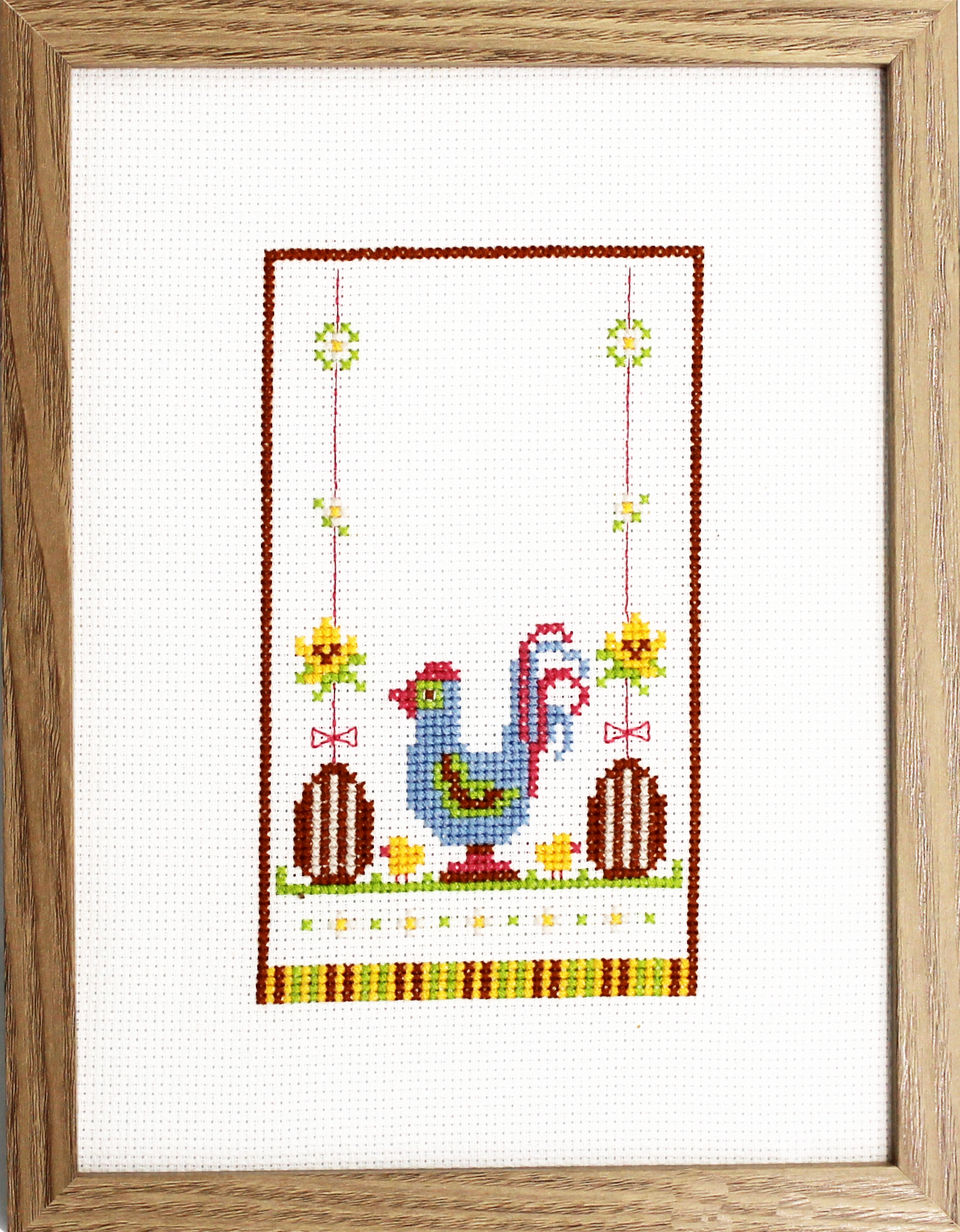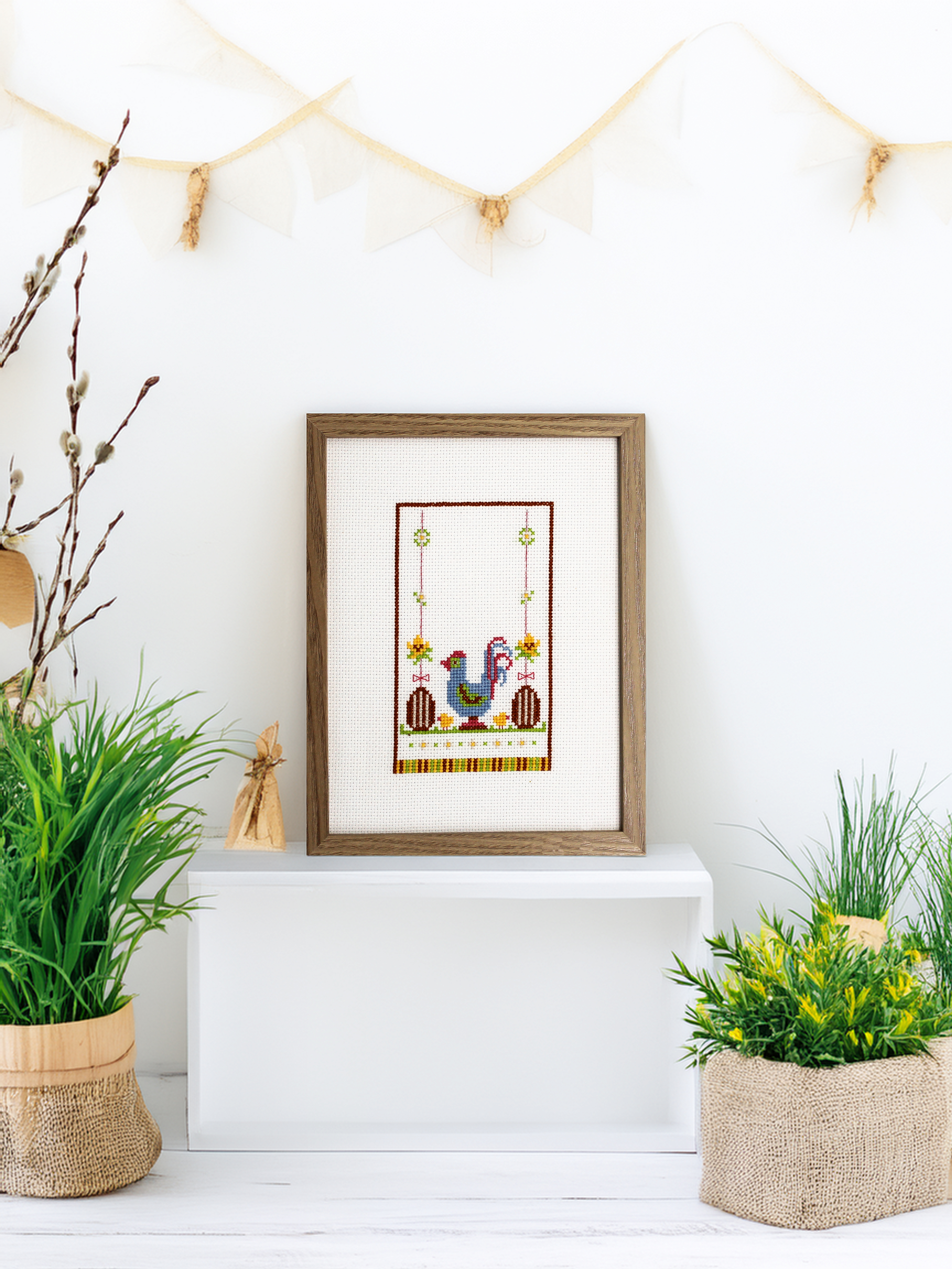Påskebillede fra OOE med hane, kyllinger og æg, der gør giver stemning i stuen