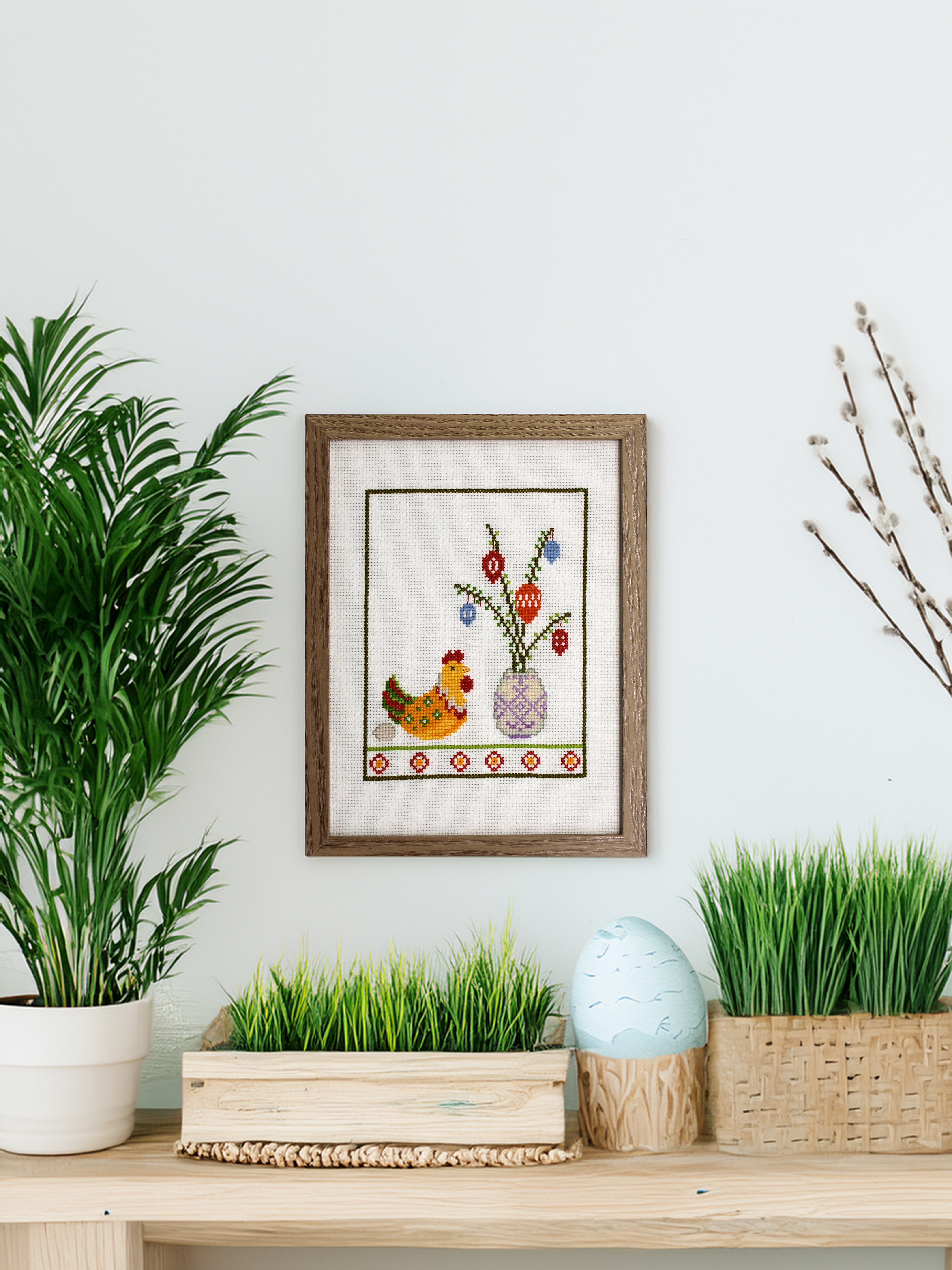Påskebillede fra OOE med høne og påskeæg, der gør giver stemning i stuen