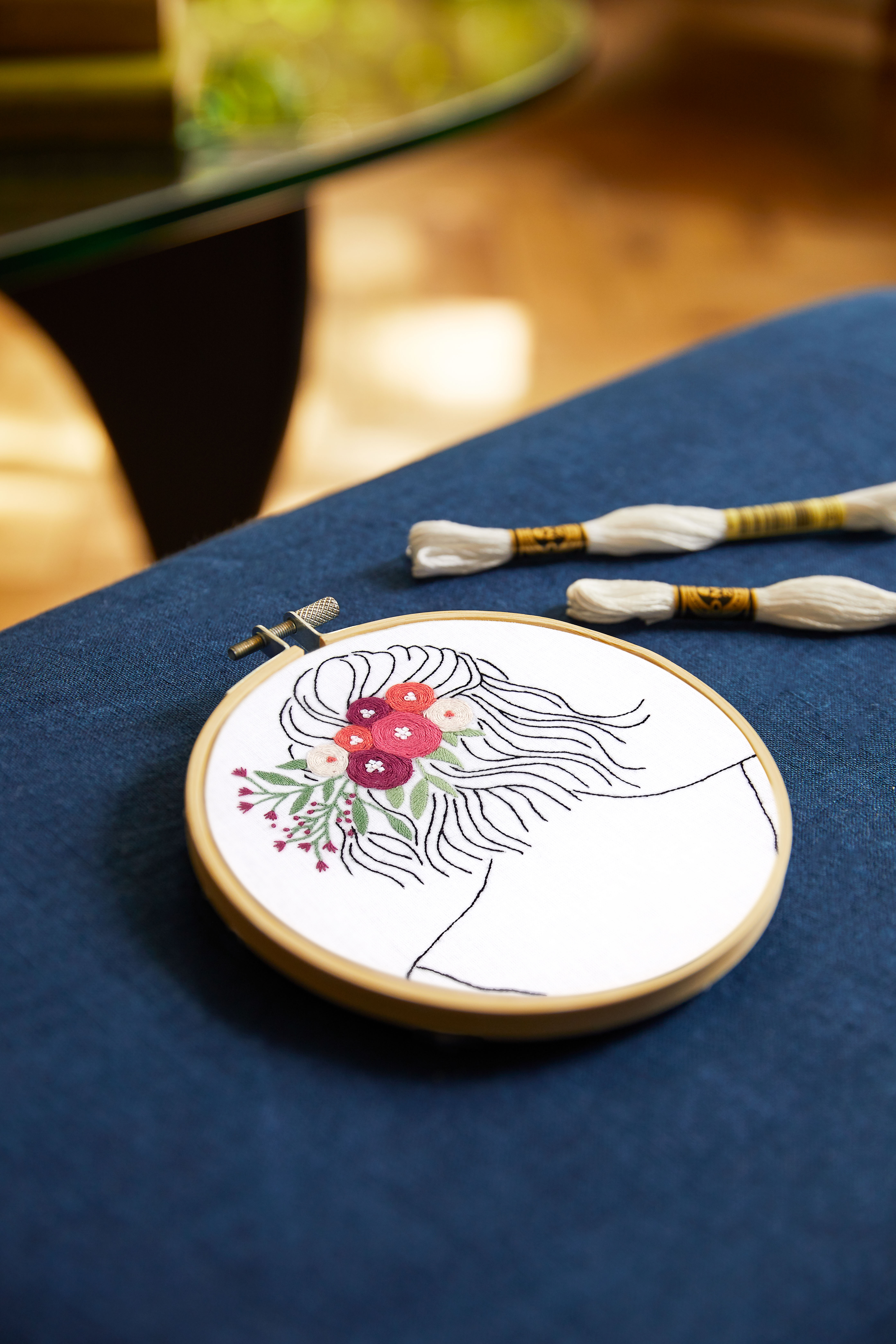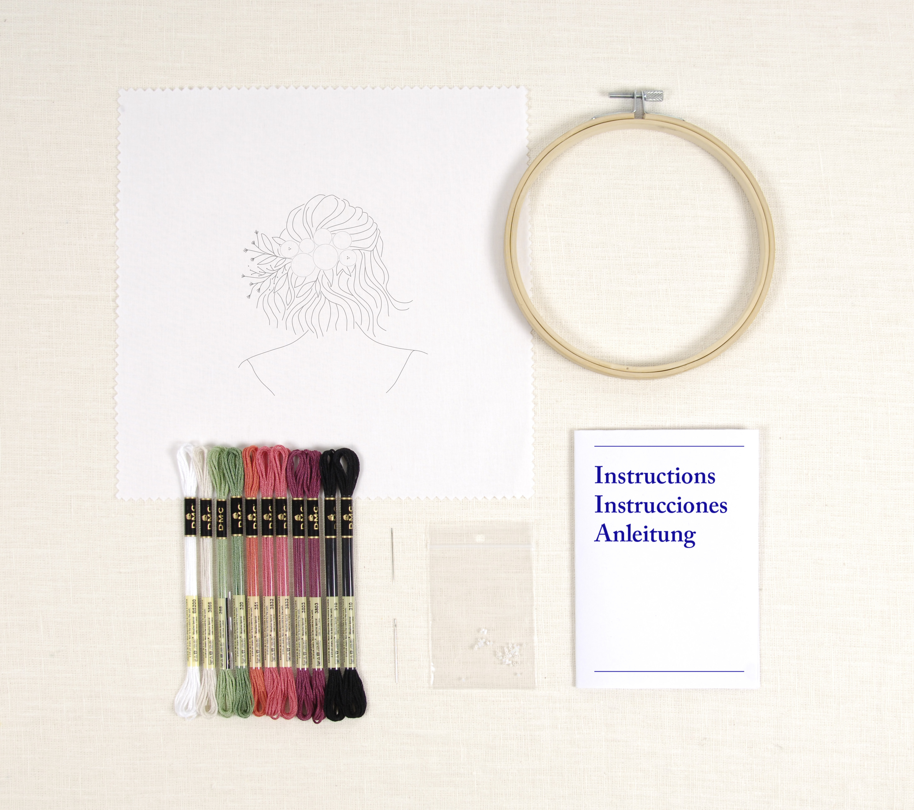 Skønt broderikit med fra DMC, der forestiller en pige med blomster i håret. Et godt kit til at få erfaring med frie og flade sting.